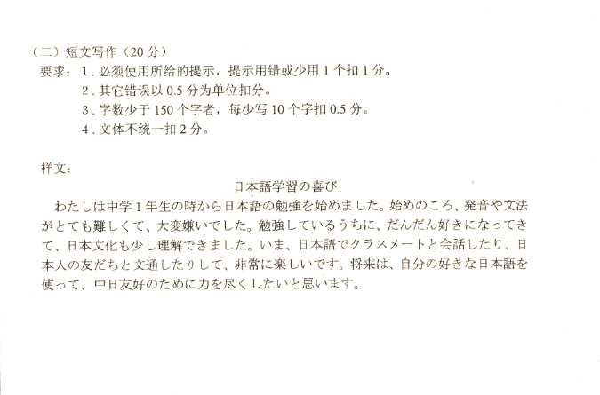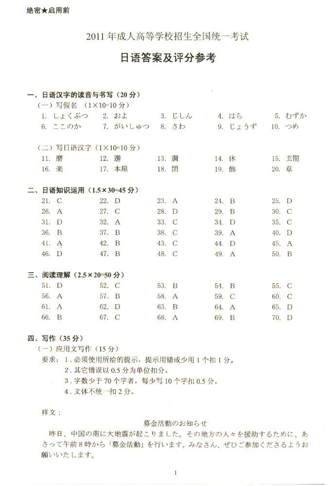 2011年全国成人高考高起点《日语》试题及答案