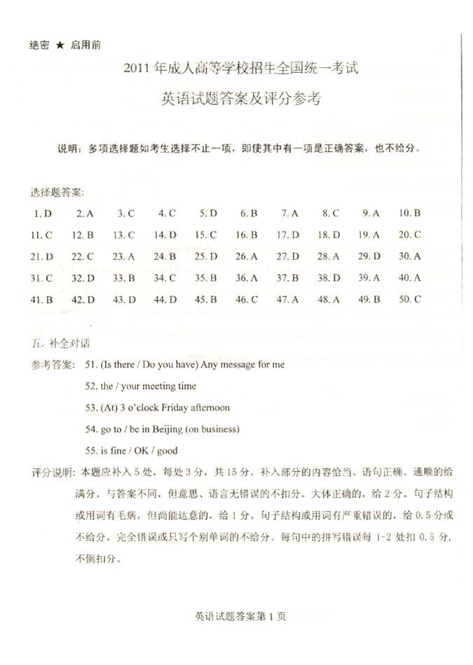 2011年全国成人高考高起点《英语》试题及答案
