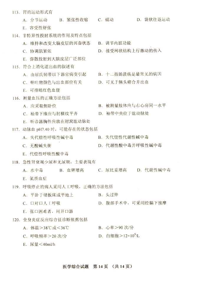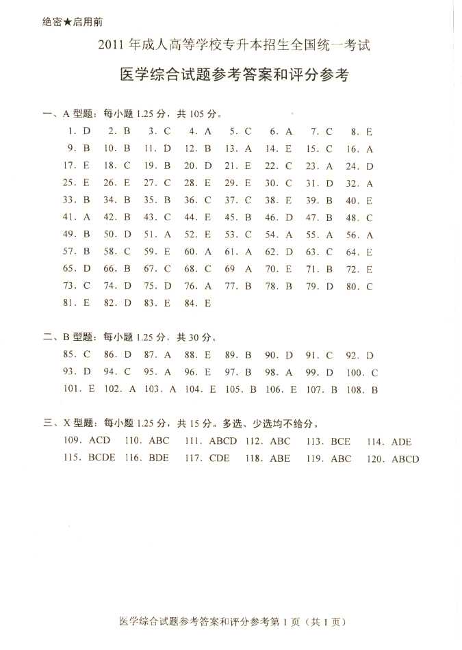 2011年全国成人高考专升本《医学综合》试题及答案