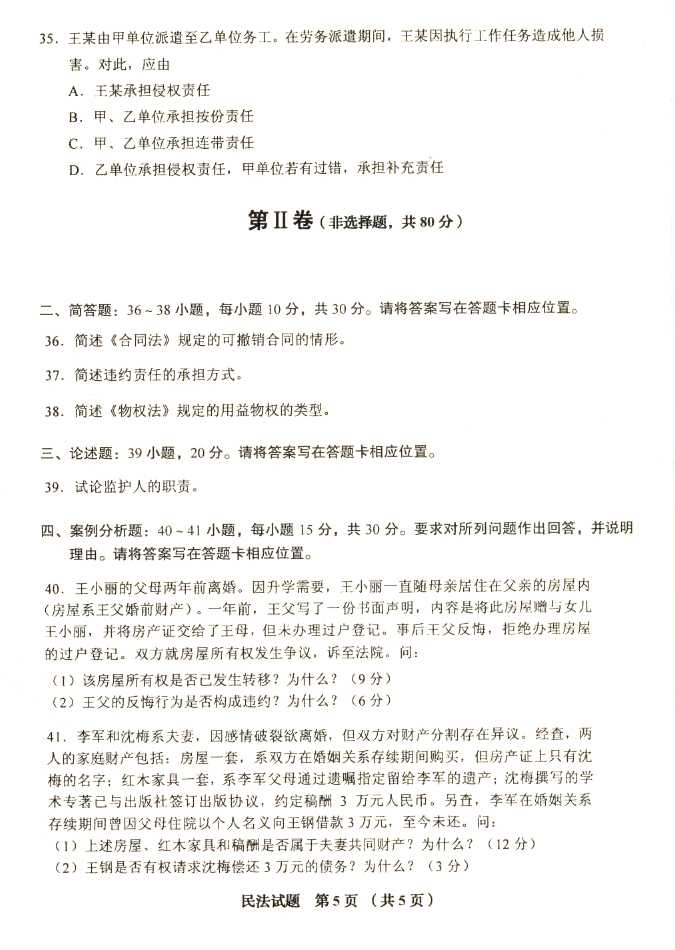 2011年全国成人高考专升本《民法》试题及答案