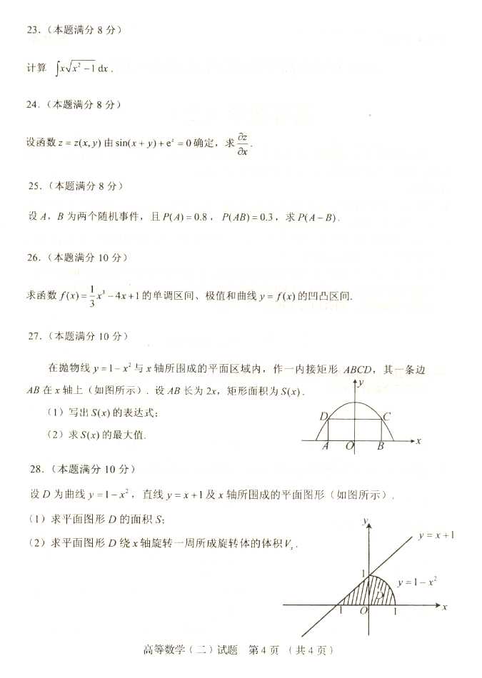 2011年全国成人高考专升本《高等数学(二)》试题及答案