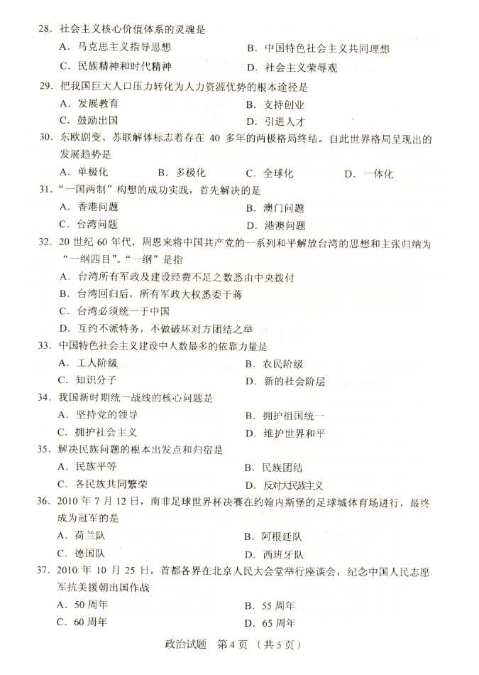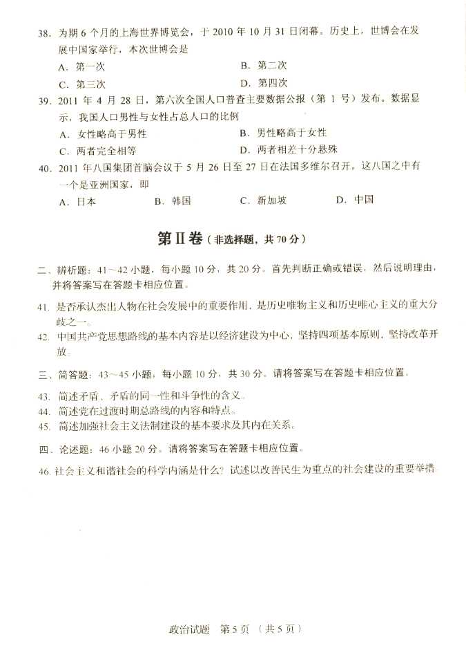 2011年全国成人高考专升本《政治》试题及答案