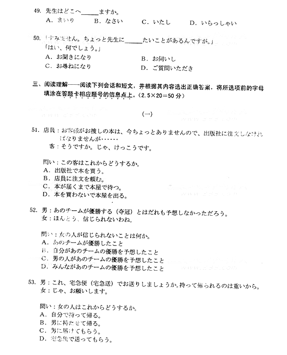 2014年成人高考高中起点《日语》真题及答案