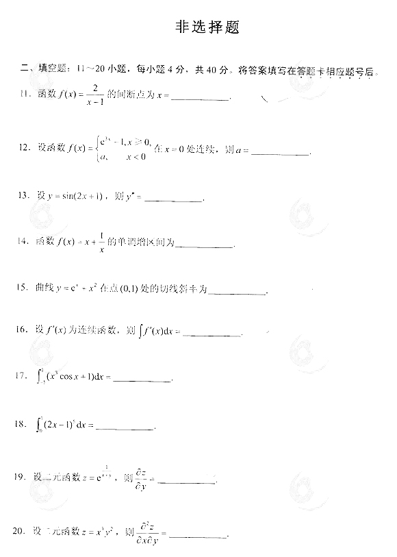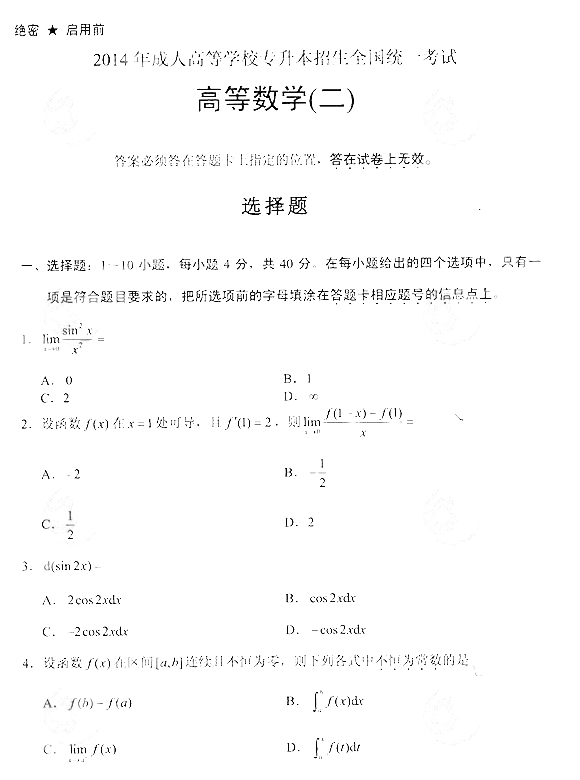 2014年成人高考专升本《高等数学(二)》真题及答案