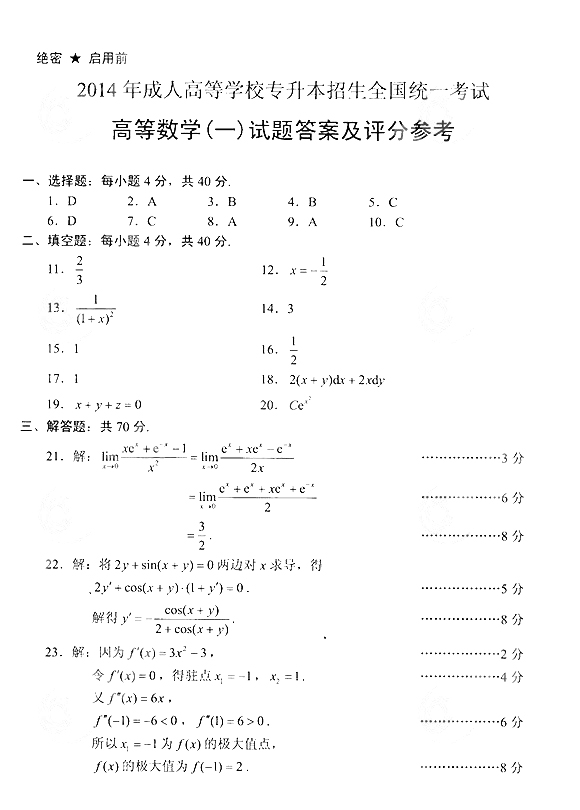 2014年成人高考专升本《高等数学(一)》真题及答案