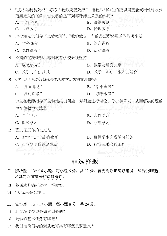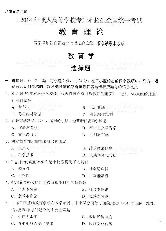 2014年成人高考专升本《教育理论》真题及答案
